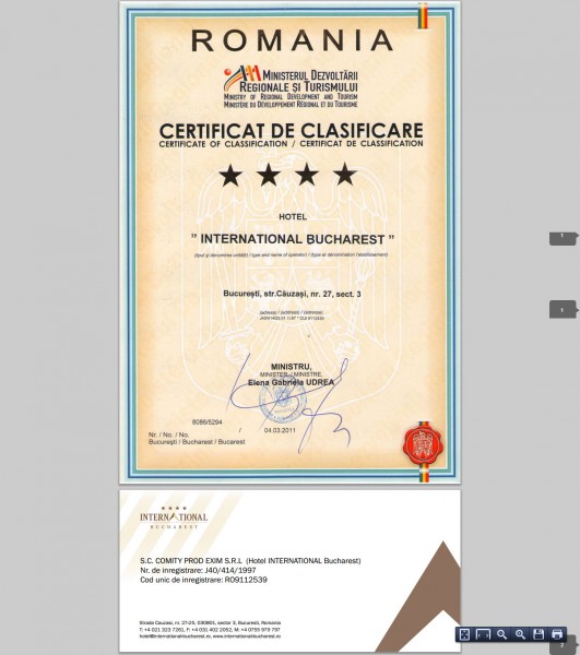 Conform Certificatului de clasificare emis de Ministerul Turismului in 2011, disponibil pe site-ul propriu, Hotelul International din Bucuresti, un hotel de patru stele amplasat la 150 de metri de Bulevardul Unirii din Capitala, pe strada Cauzasi la numarul 27, este detinut de firma Comity Prod Exim SRL.