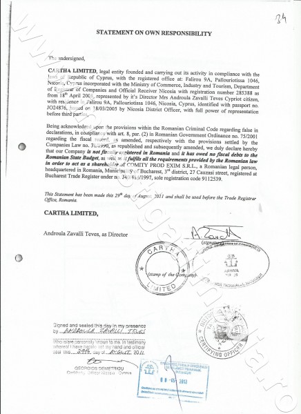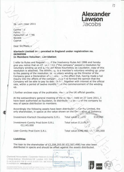 Klartech Limited, firma reprezentata de Alexandru Bogdan, se pierde in off-shore-ul cipriot. La un moment dat, directorii acesteia, probabil avocati ciprioti, decid ca firma sa fie lichidata. Activele – inclusiv participatia in Comity Prod Exim, de peste doua milioane de euro – sunt preluate de firma care o detinea integral, pe nume Cartha Limited. Aceasta firma este, la randul ei, detinuta de doua alte off-shore-uri cipriote. Asa a ajuns Cartha Limited, care “nu este inregistrata in Romania” si care “nu are obligatii fiscale catre bugetul Romaniei”, sa detina astazi, in asociere cu sotia sefului ANAF, Hotelul International din Bucuresti.