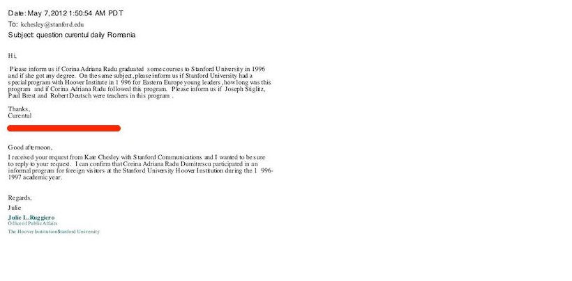 “Curentul” a facut un nou demers la Universitatea Stanford, prin care solicita toate datele legate de Corina Adriana Radu (Dumitrescu) din perioada universitara 1996-1997.