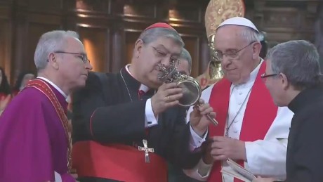 Papa Francisc a părut surprins de anunţul făcut de cardinal, el declarând apoi zâmbind: „Arhiepiscopul a spus că sângele este doar pe jumătate lichid. Se pare că sfântul ne iubeşte doar pe jumătate. Trebuie să devenim mai buni pentru ca el să ne iubească mai mult”.
