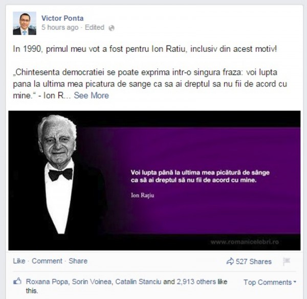 După ce s-a folosit în repetate rânduri de imaginea Simonei Halep pentru a-şi creşte popularitatea, Ponta recurge la un alt truc murdar în campania electorală. Încercând să să-şi atragă simpatia electoratului de dreapta, prezidenţiabilul a postat pe contul său de facebook o fotografie cu Ion Raţiu însoţită de un citat celebru al acestuia. „Chintesenţa democraţiei se poate exprima într-o singură frază: voi lupta până la ultima mea picătură de sânge că să ai dreptul să nu fii de acord cu mine”, au fost cuvintele rostite de liderul ţărănist în timpul dezbaterii finale din cadrul alegerilor prezidenţiale din 1990, la care a participat alături de Ion Iliescu (FSN) şi Radu Câmpeanu (PNL).