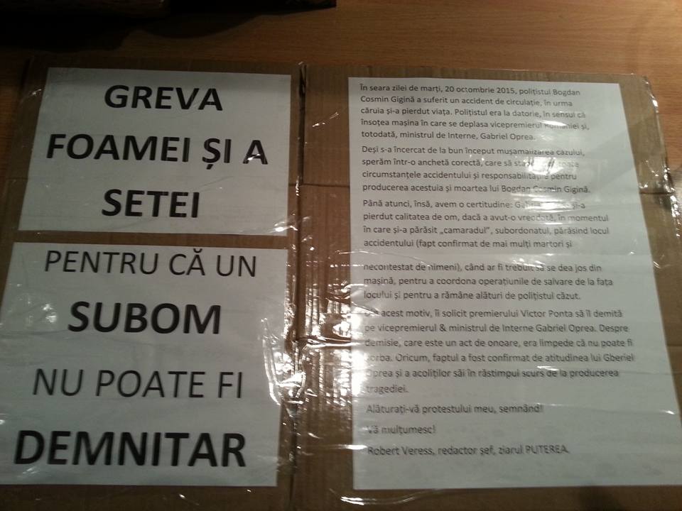 Jurnalistul Robert Veress, redactor şef al ziarului Puterea, se află în cea de-a treia zi de grevă a foamei şi a setei ca protest până ce vicepremierul Gabriel Oprea îşi va da demisia din toate funcţiile guvernamentale pe care le ocupă. Jurnalistul se află de luni în faţa Guvernului României şi îi aşteaptă pe toţi cei care sunt solidari cu protestul lui să semneze pentru demisia ministrului.