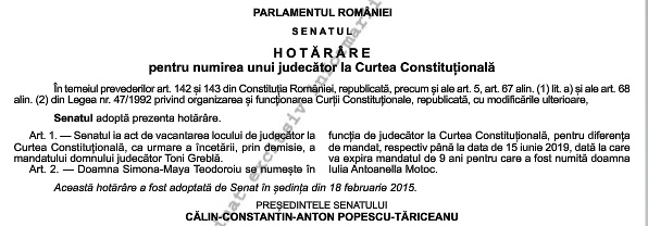 Toni Greblă fusese numit în funcţie de Senat, la propunerea PSD.