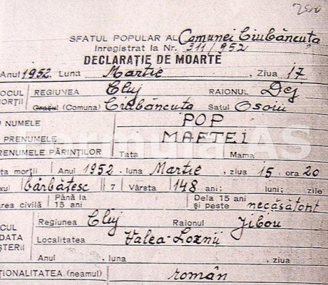 „Nu mi-a venit să cred când, la începutul acestui an, am fost sunat şi rugat să verific dacă e adevărat că prin ’52-’53 ar fi mu­rit în Osoi un om des­pre care sa­vantul I. C. Parhon scrisese că ar fi trăit 140 de ani”, îşi aminteşte Lazăr Mureşan, se­cre­tarul primăriei Ciu­­băncuţa, din care face parte cătunul Osoi. A mers într-o fugă la Arhivă şi, când colo – ce să vezi? – sur­pri­za avea să fie şi mai mare: 148 de ani! Asta scria, negru pe alb, pe certificatul de deces al lui Maftei Pop. A cerut veri­fica­rea la Arhivele de la Cluj, acolo unde se păstrează o copie a ac­telor de la Ciubăn­cuţa, şi nu era nici o gre­şeală. Maştei, bătrânul despre care aveau să-şi amin­­tească toţi osoienii mai în vârstă când au fost în­trebaţi, fusese înregistrat ca trăind 148 de ani. Un caz uimitor de longevitate, care făcuse ceva vâlvă înainte de moar­tea lui Maftei Pop, de vreme ce atrăsese atenţia unor so­mităţi precum Ana Aslan şi I. C. Parhon, a fost igno­rat în România vreme de mai bine de jumă­tate de se­col. Asta cu atât mai mult cu cât cercetări mai riguroase realizate la mo­mentul respectiv, ar fi pu­tut cer­tifica fără putinţă de contestare că Maftei Pop a fost cel mai longeviv om care a trăit vreodată pe faţa Pă­mân­tului. Există discuţii legate de un chi­nez care ar fi trăit peste 250 de ani, însă recordul „omologat” al lon­ge­vităţii îl deţine, cu 122 de ani, franţuzoaica Jeanne Cal­ment (1875-1997). După toate probabilită­ţile, Maf­tei Pop a trăit cu mult mai mult de 122 de ani…