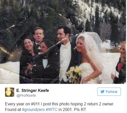 Misterul unei fotografii gasite in ramasitele de la Turnurile Gemene din New York a fost deslusit dupa mai bine de un deceniu de la atentate. Elizabeth Stringer Keefe a primit fotografia de la un amic care locuieste in New York. Poza este dintr-un album de nunta, in care apar mireasa, mirele si cativa apropiati.