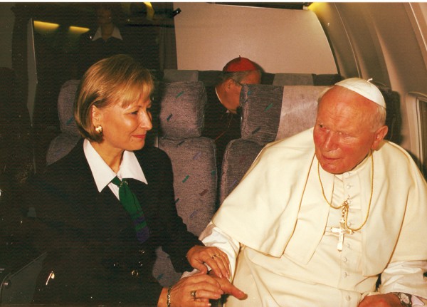 Incep cu Papa Ioan Paul al II-lea. Mai 1999, plecarea de la Bucuresti la Roma, Boeing 737. El fusese la noi in tara intre 7-9 mai. Obisnuia sa vina cu Alitalia si sa plece cu compania aeriana nationala a tarii vizitate. In cazul nostru, TAROM. Nu stiu sa-ti spun cum am ajuns pe zborul ala… Cred ca cineva a apreciat ca trebuie sa fac parte din echipaj pentru ca eram o tipa corecta si devotata meseriei si cu o atitudine foarte prietenoasa fata de pasageri. S-a facut un echipaj de 6 insotitori de bord in loc de 5, cati eram de obicei. Nici nu pot sa-ti spun ce am simtit inainte de acel zbor. Eu sunt o persoana religioasa si in toate vizitele facute peste hotare mergeam la biserici catolice, deci eram apropiata de biserica lor. Nu mi-a displacut niciodata stilul lor, cred ca au o eleganta in biserica pe care rar o intalnesti.