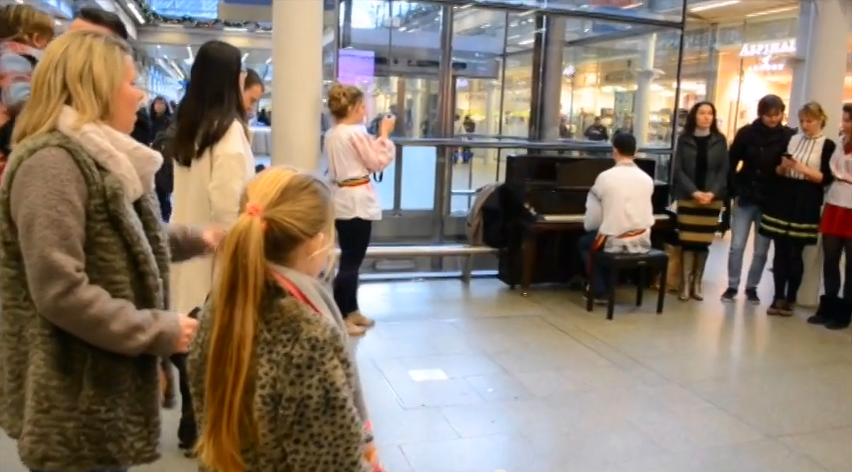 Mai multi tineri romani au cantat cantece de Craciun in Saint Pancras, una dintre cele mai mari gari din Londra, cu scopul de a promova traditiile romanesti.