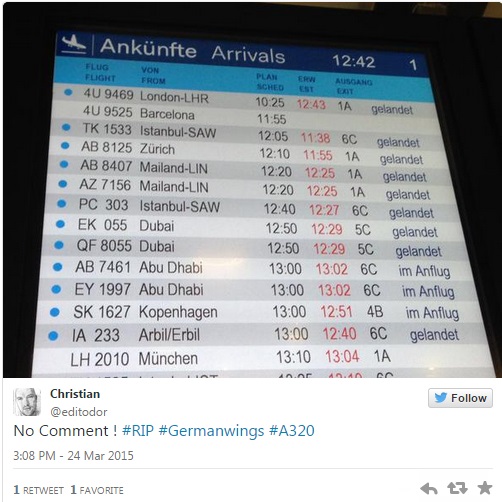 15.45 – Premierul Victor Ponta a reactionat pe Twitter: „Am primit cu mare tristete stirea groaznica privind accidentul aviatic din Franta. Gandurile mele se indreapta catre familiile victimelor”.
