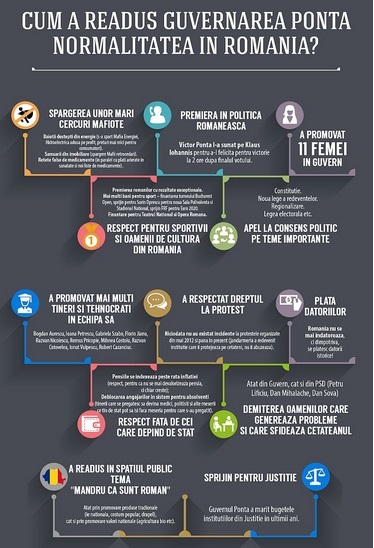 Pe site-ul Partidului Social Democrat (PSD) a fost publicată, la rubrica „Știri”, o infografie plină de greșeli gramaticale în care ne sunt prezentate într-o manieră elogioasă, de-a dreptul propagandistică, măsurile prin care guvernarea Ponta a readus „normalitatea” în România.