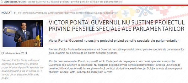 „Poziţia doamnei ministru Plumb, exprimată ieri în Parlament, de respingere a unor pensii speciale, este poziţia Guvernului şi o susţinem în continuare. Nu susţinem proiectul privind pensiile parlamentarilor. Cred că un sistem de pensii echilibrat doreşte toată lumea şi avem încă de făcut eforturi în această direcţie. Soluţia nu este să avem pensii speciale”, a declarat pe 10 decembrie 2014 Victor Ponta, la începutul şedinţei de Guvern. Colegii săi din Parlament îi pregătesc însă o nouă surpriză premierului Ponta şi deja prin vocea lui Marian Neacşu anunţă că susţin pensiile speciale.