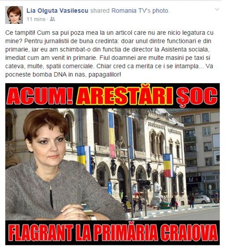 ”Ce tampiti! Cum sa pui poza mea la un articol care nu are nicio legatura cu mine? Pentru jurnalistii de buna credinta: doar unul dintre functionari e din primarie, iar eu am schimbat-o din functia de director la Asistenta sociala, imediat cum am venit in primarie. Fiul doamnei are multe masini pe taxi si cateva, multe, spatii comerciale. Chiar cred ca merita ce i se intampla… Va pocneste bomba DNA in nas, papagalilor!”, e mesajul primarului din Craiova.