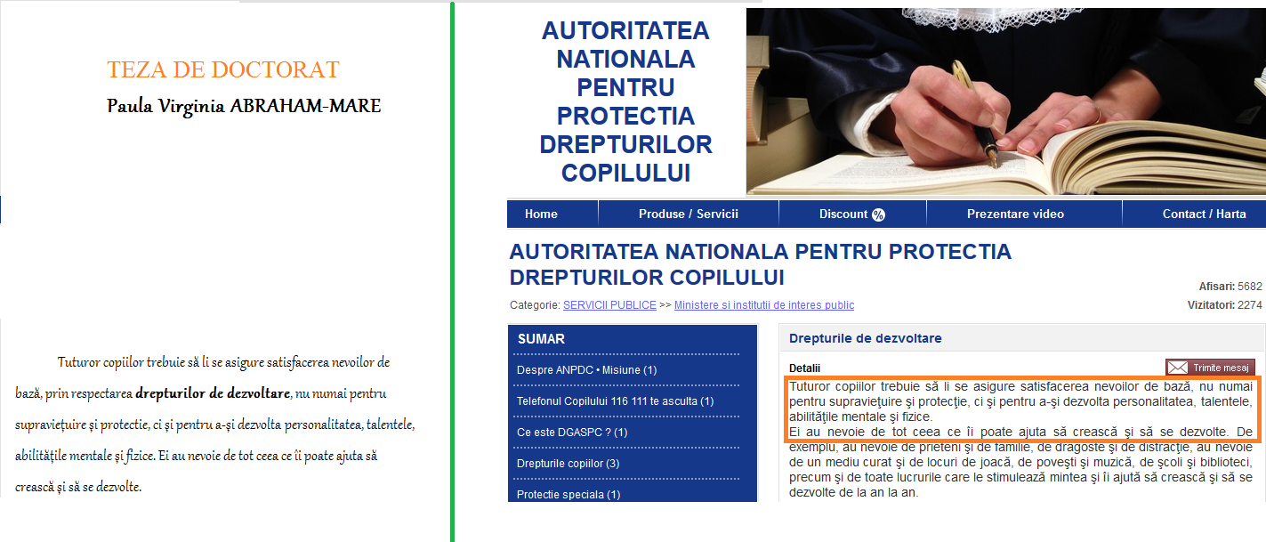 Dupa fraza de inceput amintita mai sus, urmeaza, desigur, o alta 🙂 „Tuturor copiilor trebuie să li se asigure satisfacerea nevoilor de bază, prin respectarea drepturilor de dezvoltare, nu numai pentru supravieţuire şi protectie, ci şi pentru a-şi dezvolta personalitatea, talentele, abilităţile mentale şi fizice. Ei au nevoie de tot ceea ce îi poate ajuta să crească şi să se dezvolte„. Nimic original, doar copy-paste de pe site-ul Autoritatii Nationale pentru Protectia Copilului, dupa cum o arata colajul de mai jos: