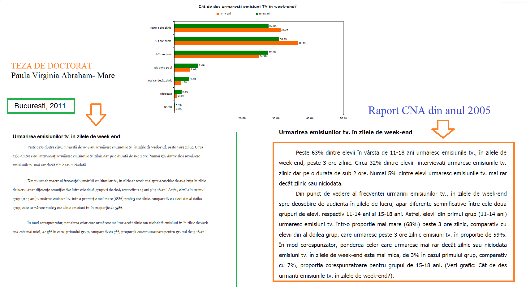Ultimul exemplu pe care il vedeti ar fi putut fi urmat de foarte multe altele, pentru ca partea „stiintifica” din aceasta teza de doctorat din 2011 e copy-paste dintr-un raport facut la comanda CNA de CURS in anul… 2005!!!
