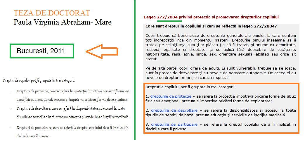 In continuare va ofer multe exemple si mai putin text. Retineti insa, rezumatul oricarei teze de doctorat ar trebui sa cuprinda cele mai importante idei si rezultate ale cercetarii stiintifice! Dupa cum veti vedea mai jos, nu e cazul in aceasta lucrare semnata de Paula Virginia Abraham- Mare. La fiecare exemplu voi indica in paranteza si linkul cu care se ajunge la sursa de „inspiratie” a doamnei doctor Abraham, ca sa le fie mai usor celor din Comisia de Etica a Universitatii Bucuresti 🙂