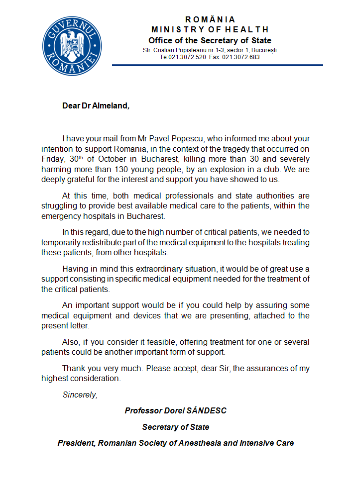 Acum iata si DOVADA ca spitalele noastre nu aveau destule echipamente medicale absolut obligatorii in situatii de urgenta! Secretarul de stat din Ministerul Sanatatii de la acea data, Dorel Sandesc, le-a scris norvegienilor sa ne ajute cu ventilatoare mecanice, catetere, aparate de monitorizare a functiilor vitale etc, asa cum puteti citi in documentele pe care le public aici in EXCLUSIVITATE. Ce e foarte grav insa este caaceasta cerere de ajutor a fost trimisa, ATENTIE, la aproape SASE zile dupa tragedia din #Colectiv, adica pe 05.11.2015, la ora 23.31! Deci vreme de o saptamina, Arafat si Banicioiu s-au incapatinat sa dovedeasca ei ce bine gestioneaza criza, apoi au dat in bilbiiala si au inceput sa ceara ajutor din strainatate pe doua directii: transferul ranitilor si echipamente medicale.