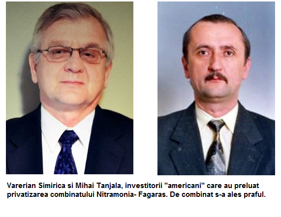 Pina la momentul acela e bine sa va reamintesc ca Nitramonia a fost la un moment dat privatizata de o firma condusa de numitii Mihai Tanjala si Valerian Simirica. Mihai Tanjala a fost ofiter acoperit al Contrainformatiilor Militare inainte de 1989 si ofiter “doi si-un sfert” pina in 1992, iar partenerul lui, Valerian Simirica, “americanul”, se pare ca era infiltrat de Securitate in comunitatea romanilor din Chicago. Afirmatiile legate de calitatea de turnator la Securitate a lui Simirica si, mai apoi, de colaborator al SIE, ii apartin lui Mihai Tanjala si le veti putea citi intr-un interviu cu acesta pe care-l voi publica intr-un episod viitor al acestei anchete. In acelasi interviu veti afla si alte detalii despre implicarea oamenilor din serviciile secrete dupa 1989 in marile tunuri post-decembriste, de la privatizarea fostelor intreprinderi de stat si pina la afacerile cu despagubiri in bani si actiuni la Fondul Proprietatea. Deocamdata insa, sa revenim la cazul Nitramonia.