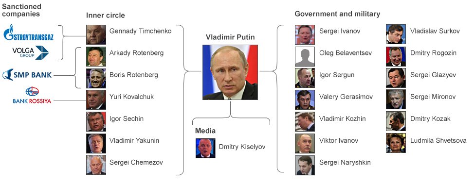 SUA şi UE au anunţat noile nume de pe lista persoanelor sancţionate în urma agravării situaţiei din Ucraina. Ţintele noilor măsuri sunt membri ai camarilei lui Putin- oligarhi implicaţi în industria energetică, în cea a armamentului, în televiziune, în domeniul bancar, cel politic şi militar. Printre numele cele mai importante sunt următoarele: Gennady Timcenko, fraţii Arkady şi Boris Rotenberg, Igor, Sechin, Iuri Kovalciuk, Sergei Ivanov, Vladimir Yakunin, Vladimir Kozhin, Viktor Ivanov, Vladislav Surkov, Dmitri Rogozin, Sergei Glazyev, Sergei Cemezov, Dmitri Kiselyov, Valeri Gerasimov, Igor Sergun.
