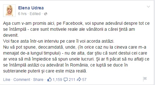 „Aşa cum v-am promis aici, pe Facebook, voi spune adevărul despre tot ce se întâmplă – care sunt motivele reale ale vânătorii a cărei ţintă am devenit.