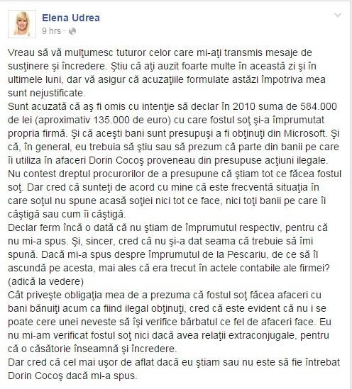 Cât priveşte obligaţia mea de a prezuma că fostul soţ făcea afaceri cu bani bănuiţi acum ca fiind ilegal obţinuţi, cred că este evident că nu i se poate cere unei neveste să îşi verifice bărbatul ce fel de afaceri face. Eu nu mi-am verificat fostul soţ nici dacă avea relaţii extraconjugale, pentru că o căsătorie înseamnă şi încredere„, spune Elena Udrea tot pe Facebook.