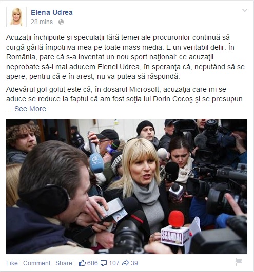 „Acuzaţii închipuite şi speculaţii fără temei ale procurorilor continuă să curgă gârlă împotriva mea pe toate mass media. E un veritabil delir. În România, pare că s-a inventat un nou sport naţional: ce acuzaţii neprobate să-i mai aducem Elenei Udrea, în speranţa că, neputând să se apere, pentru că e în arest, nu va putea să răspundă. Adevărul gol-goluţ este că, în dosarul Microsoft, acuzaţia care mi se aduce se reduce la faptul că am fost soţia lui Dorin Cocoş şi se presupune că aş fi ştiut ce făcea acesta. Pornind de aici, se fabulează şi se inventează poveşti nemuritoare. Dar asta se ştia şi înainte de 29 ianuarie, când am fost pusă sub acuzare, se ştia şi anul trecut, când s-a deschis dosar împotriva lui Dorin Cocoş. Între timp, nimic nou, nicio probă suplimentară”, a scris Udrea pe Facebook.