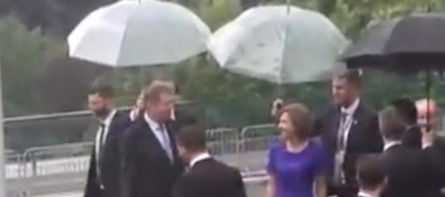 Președintele Klaus Iohannis și soția sa, păziți de o armată de umbrele în Luxemburg. Evident, imaginea a fost distribuită intens online, ocazie cu care mulți și-au amintit de un alt episod în care a fost implicat președintele. Aflat în vizită în Franța, chiar la începutul mandatului, Iohannis și-a aruncat paltonul pe capota mașinii, nemulțumit că nimeni nu îl ajută, scrie b1.ro.