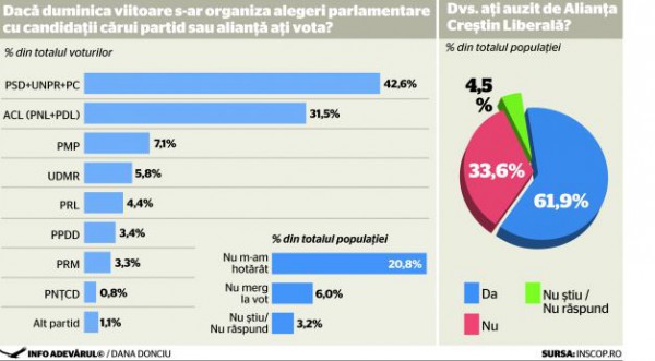 Pe primul loc, în preferinţele electoratului, se află candidatul PSD-UNPR-PC, care ar fi votat de 42,6%. Urmează, în ordine, Partidul Mişcarea Populară (7,1%), Uniunea Democrată a Maghiarilor din România (5,8%), Partidul Liberal Reformator (4,4%), Partidul Poporului Dan Diaconescu (3,4%), Partidul România Mare (3,3%), Partidul Naţional Ţărănesc Creştin Democrat (0,8%).