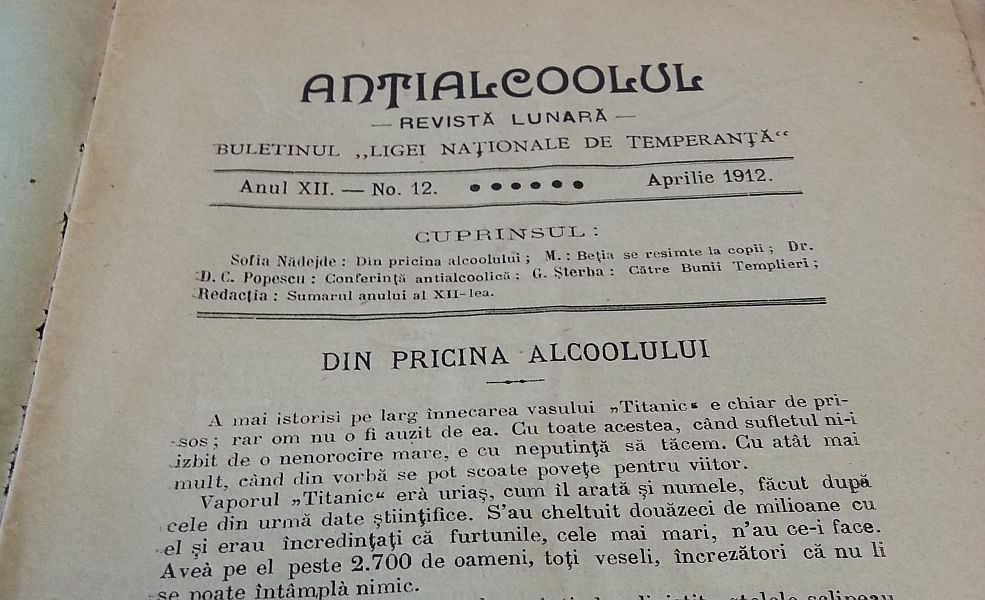 „Când am auzit de nenoricirea vasului Titanic, de împrejurările în cari s-a scufundat, am zis: „M-aș prinde că la mijloc trebuie să fie băutura necumpănită, care o obișnuiesc mai toți marinarii. E cu neputință ca o minte neațâțată ori o judecată netoropită de alcool, să nu-și dea seama de primejdia ghețarilor”, se spune în editorialul revistei lunare Antialcoolul, „Buletinul „Ligei Naționale de Temperanță”, din aprilie 1912. Articolul este semnat de Sofia Nădejde.