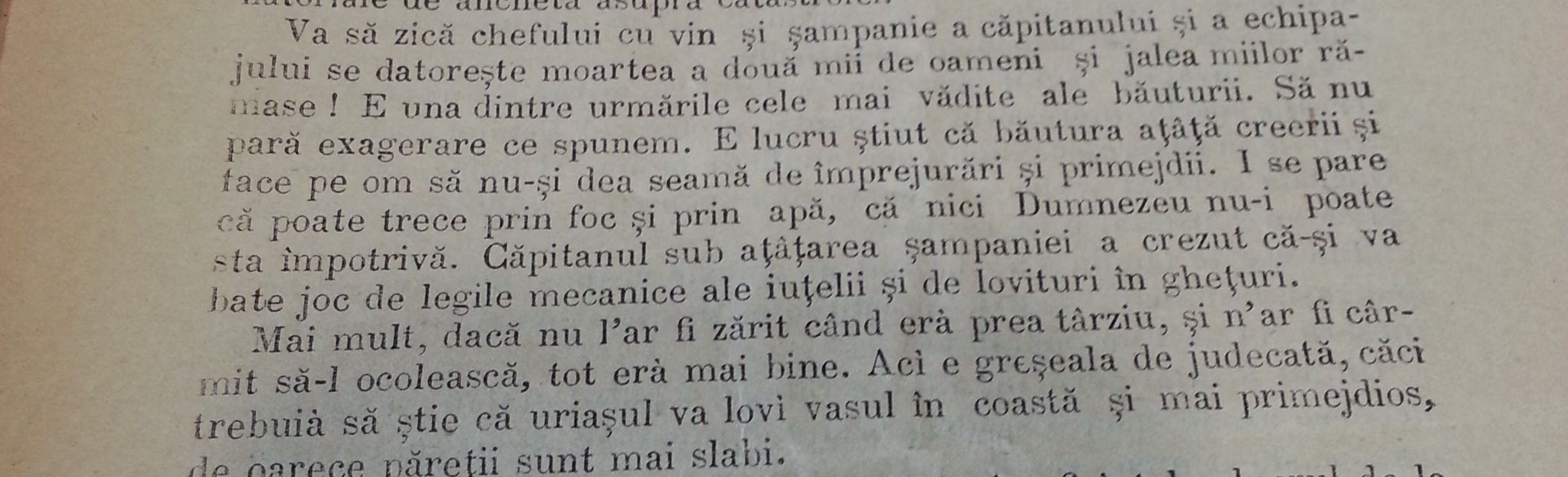Atunci s-a hotărât să dea singur semnalul de alarmă. Din nenorocire, căpitanul Smith și ceilalți ofițeri ai bastimentului băuseră și ei mult la nefastul ospăț. (…) Va să zică chefului cu vin și șampanie a căpitanului și a echipajului se datorește moartea a două mii de oameni și jalea miilor rămase”, concluzionează Sofia Nădejde în articolul din revista din 1912, citat de site-ul greatnews.ro