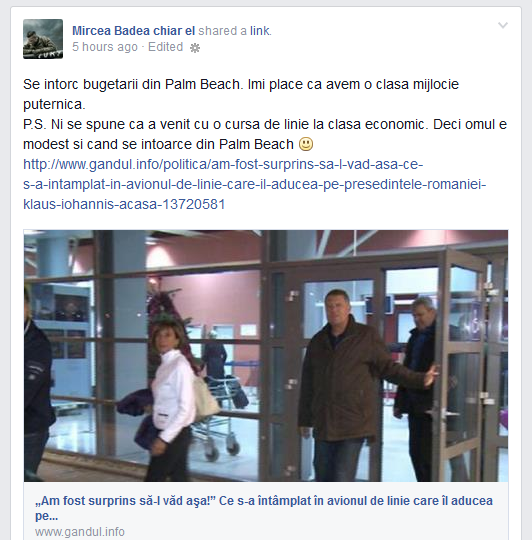Iată ce scrie Badea pe Facebook: „Se intorc bugetarii din Palm Beach. Imi place ca avem o clasa mijlocie puternica. P.S. Ni se spune ca a venit cu o cursa de linie la clasa economic. Deci omul e modest si cand se intoarce din Palm Beach.”