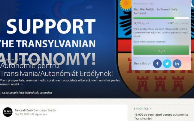 Un clujean a depus azi, 15 februarie, o petiţie pentru autonomia economică a Ardealului. Fancsali Ernest Erno (23 de ani) cere guvern regional la Cluj care să controleze politic şi economic regiunea Transilvaniei, dar care să fie subordonat Bucureştiului. Petiţia are 14.658 de semnături.