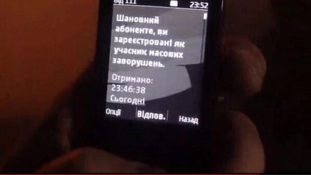 Asta-i mesajul text pe care mii de protestatari ucrainieni l-au primit ieri pe telefoanele mobile, ca urmare a unei noi legi ce a intrat în vigoare, lege care interzice demonstrațiile publice. Mesajul text total anormal a fost trimis de forțele de poliție ale regimului ca o completare a noii legislații, la fel de anormală și ea. De fapt, toată situația e de-a dreptul Orwelliană (urăsc adjectivul ăsta și-l folosesc numai atunci când chiar este absolut necesar, jur).