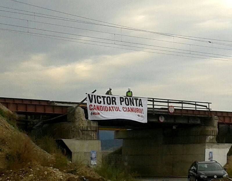 Un banner cu mesajul ”Victor Ponta, candidatul cianurii” a fost afişat de activiştii care se opun proiectelor miniere pe bază de cianuri cu ocazia lansării candidaturii premierului la Alba. Bannerul de mari dimensiuni a fost afișat în imediata apropiere a reuniunii la care au participat numeroși membri de partid din toată țara. Victor Ponta, primul ministru al României, se află la un complex turistic de la marginea orașului Alba Iulia care găzduiește Congresul Național al PSD pentru validarea candidaturii acestuia la alegerile prezidenţiale.