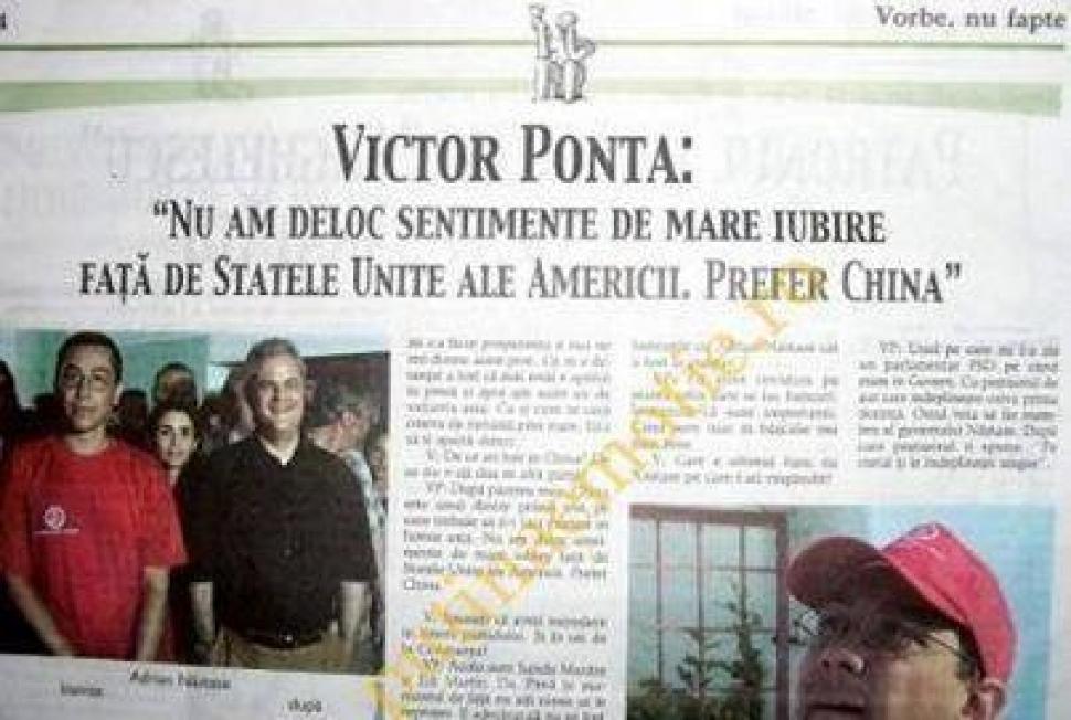 Există un interviu al lui Victor Ponta, din 2005, când acesta nu era nici premier, nici măcar procuror. Era doar un tânăr membru al tineretului PDSR, e drept unul cu potenţial. Pentru că era învăţăcelul lui Adrian Năstase. Un Năstase care tocmai fusese premier. Titlul articolului: „Victor Ponta:Nu am deloc sentimente de mare iubire faţă de Statele Unite ale Americii. Prefer China”. a apărut în ediţia print a gandul.ro