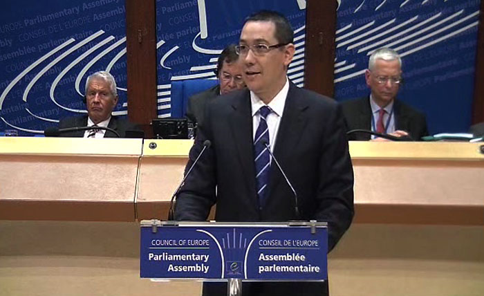 ”Aș dori să subliniez cât de importantă este pentru mine şi pentru oamenii care mi s-au alăturat astăzi – preşedintele Parlamentului român, consilierii mei speciali şi membri distinşi ai acestei reuniuni, domnul Frunda – faptul că mă aflu aici cu dumneavoastră pentru a prezenta un mesaj clar privind angajamentul Guvernului român de a respecta toate valorile Consiliului Europei – determinarea noastră să învăţăm din greşelile trecutului şi să ne gândim la viitorul nostru comun, un viitor care presupune democraţie, respectarea drepturilor omului şi a statului de drept în ţara mea”, a declarat Ponta la Adunare.