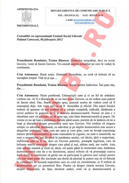 Victor Ponta a cerut sa vada stenogramele consultatiei de la Cotroceni din data de 6 februarie, convins ca Traian Basescu minte. Insa, luni, presedintele PSD a declarat ca stenogramele sunt adevarate, dar insuficiente, dorind sa i se puna la dispozitie atat inregistrarile de la intalnirea cu Opozitia, cat si cele de la discutiile cu celalalte partide.