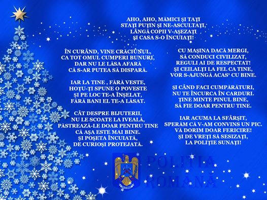 Poliţiştii din Călăraşi au compus un ”colind cu sfaturi preventive” pentru localnici – ”Aho, aho, mămici şi taţi/ Staţi puţin şi ne-ascultaţi/ Lângă copii v-aşezaţi/ Şi casa s-o încuiaţi” – şi au împodobit un brad la intrarea în sediul Poliţiei Judeţene, în care au agăţat şi bileţele cu îndemnuri.
