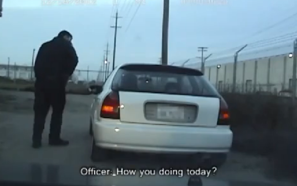 Pe imaginile care au fost filmate de camera de pe bordul masinii de politie se vede cum oftierul coboara si se duce spre soferul pe care l-a oprit.