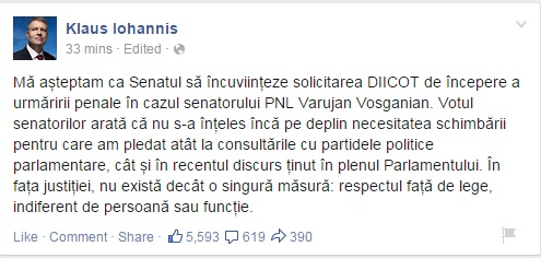 „Mă așteptam ca Senatul să încuviințeze solicitarea DIICOT de începere a urmăririi penale în cazul senatorului PNL Varujan Vosganian. Votul senatorilor arată că nu s-a înțeles încă pe deplin necesitatea schimbării pentru care am pledat atât la consultările cu partidele politice parlamentare, cât și în recentul discurs ținut în plenul Parlamentului. În fața justiției, nu există decât o singură măsură: respectul față de lege, indiferent de persoană sau funcție”, a scris Iohannis pe Facebook.