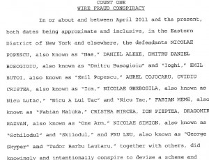 Dumitru, Skilodul, Gheboșilă, Butoi, Nae, Cojocaru, Ica, Alexe, Cristea, Fnu Lnu, Fabian, Dragomir, Skyper și Pieptea sunt români care stăpânesc bine limba engleză și mânuitori de primă mână ai comerțului online, potrivit rechizitoriului FBI. În 2011, câțiva dintre ei erau deja stabiliți în Statele Unite. Alții se aflau în România sau prin alte țări europene. Toți aceștia mai au în comun și un dosar penal în New York pentru o serie de înșelătorii online din perioada aprilie 2011 – decembrie 2012.