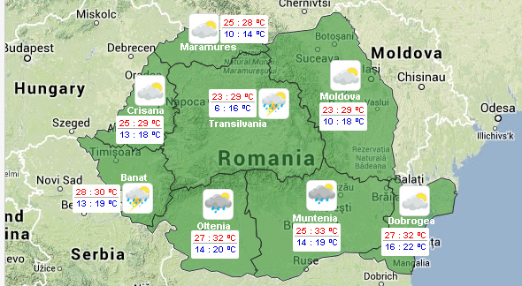 Vineri, norii mai groşi acoperă temporar zonele de munte, cu precădere Carpaţii Occidentali şi Meridionali, dar nu lipsesc nici din Oltenia, zone în care local vor fi averse însoţite de fulgere şi tunete. Vor fi condiţii pentru căderi de grindină, dar şi ploi ce lasă în urmă chiar şi mai mult de 25 l/mp. În celelalte regiuni avem parte de soare, dar şi de ceva nori, însă ploile, fulgerele şi tunetele sunt mai puţine. Vorbim despre apariţia lor pe arii restrânse în Transilvania şi doar izolat în celelalte regiuni. Vântul suflă mai tare în est şi în sud-est, dar şi în timpul ploilor în celelalte regiuni. Maximele termice nu mai ajung la valori caniculare, meteorologii prognozează de la 23 grade în nordul Moldovei până la 33 grade în Bărăgan.